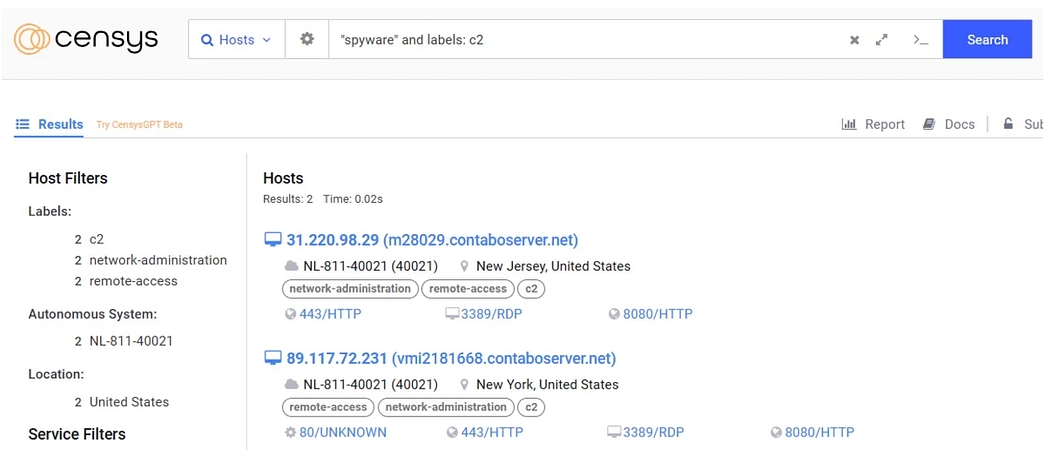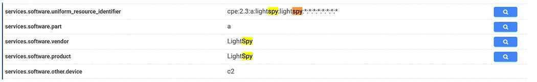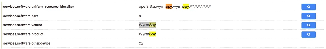 services.software.uniform_resource_identifier: cpe:2.3:a:wyrmspy:wyrmspy:*:*:*:*:*:*:*:*I then identified a pattern — you can see where I’m going: the term “spy,” which in our current cases, appeared in the services.software.uniform_resource_identifier field of both C2 servers. Using the C2 filter proved to be the right choice.