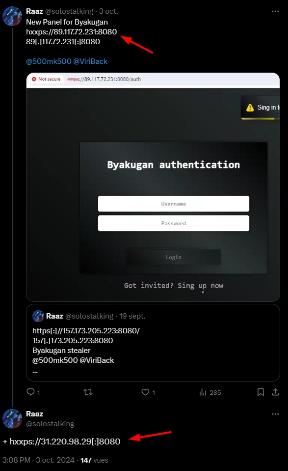 A web search allows pivoting to post X from an analyst who flagged these IPs as C2 panels for the Byakugan malware: