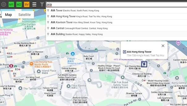 First building: A satellite view analysis reveals that it does not match the original image, mainly due to barriers and a lack of visual correspondences.